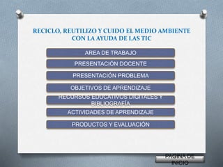 El documento presenta un proyecto educativo sobre reciclaje y cuidado del medio ambiente utilizando las TIC. El proyecto se enfoca en las ciencias naturales y concientizar a estudiantes de primaria y la comunidad sobre la importancia de reciclar bolsas plásticas y evitar la contaminación. Los objetivos son enseñar sobre la conservación ambiental y convertir bolsas plásticas en objetos útiles. Se presentan recursos educativos digitales y bibliografía, y las actividades incluyen videos animados sobre el impacto de la contamin