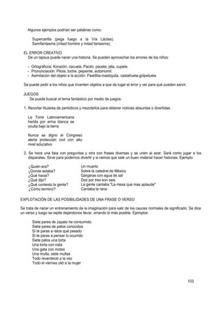 Este documento presenta varias técnicas creativas para el desarrollo de la lectura, escritura y expresión oral en niños, incluyendo juegos de palabras al azar, historias hipotéticas, deformación de palabras con prefijos, aprovechar errores para crear historias, historias cómicas y dramáticas, y usar objetos de manera arbitraria para fomentar la imaginación.