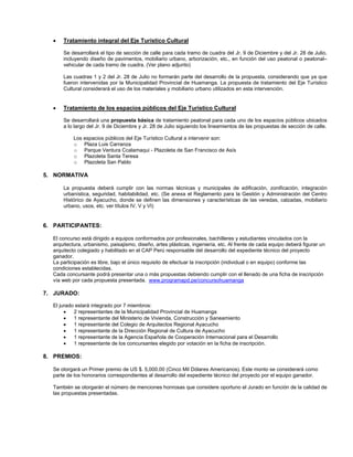 Este documento anuncia un concurso de ideas para el tratamiento integral de la Plaza Mayor y el Eje Turístico Cultural en el Centro Histórico de Huamanga, Ayacucho. El objetivo es impulsar la rehabilitación urbana del área para hacerla un espacio público accesible y vivo que conserve su patrimonio histórico. El concurso es organizado por la municipalidad provincial de Huamanga y otras instituciones. Se premiará la mejor propuesta con $5,000 dólares para desarrollar el proyecto.