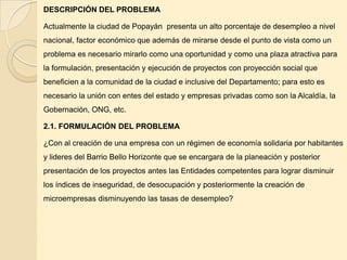 Este documento presenta una propuesta de proyecto para crear una empresa de economía solidaria en el Barrio Bello Horizonte de Popayán, Colombia. El proyecto busca disminuir los índices de desempleo, inseguridad y ocupar el tiempo libre de los residentes a través de actividades deportivas, lúdicas y capacitaciones. Se realizará una investigación descriptiva para caracterizar la situación actual y las necesidades de los habitantes. El proyecto podría beneficiar a la comunidad mejorando la convivencia y generando oportunidades laborales