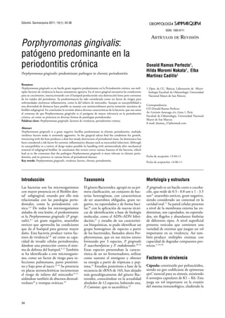 Porphyromonas gingivalis es un patógeno gram negativo predominante en la periodontitis crónica. Produce múltiples factores de virulencia como cápsula, endotoxina, vesículas de membrana externa, hemaglutininas, fimbrias y proteasas que le permiten invadir células, evadir el sistema inmune y destruir tejidos periodontales. Su presencia en el biofilm subgingival causa una inflamación y destrucción ósea progresiva. Además, su predominio se ha relacion