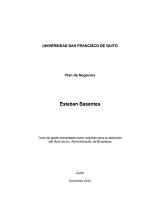 El documento presenta un resumen de un plan de negocios para la obtención de un título de Licenciatura en Administración de Empresas. El plan de negocios analiza factores internos y externos clave para el éxito empresarial como el análisis DAFO y establecimiento de objetivos. También incluye planes de marketing, operaciones, recursos humanos y proyecciones financieras. El plan ayuda a guiar al empresario para alcanzar sus metas a corto y largo plazo de manera viable.