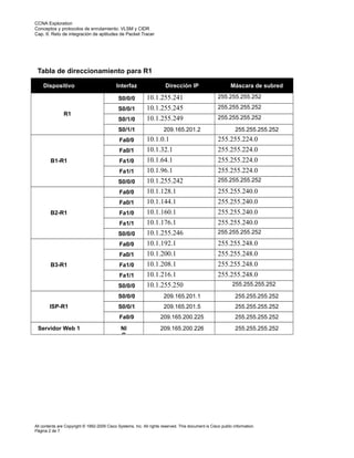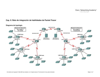 Este documento describe un ejercicio de Packet Tracer que involucra la configuración de enrutamiento estático y RIP en una topología de red. El objetivo es diseñar un esquema de direccionamiento, configurar dispositivos de red básicos, configurar enrutamiento estático entre routers ISP, y configurar RIP en una región y enrutamiento estático en otra para probar la conectividad entre todos los dispositivos.