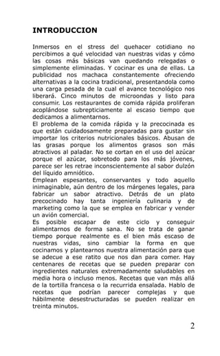 Este documento presenta un libro de recetas titulado "106 recetas esenciales" por Xavier Molina. En la introducción, el autor argumenta que es posible cocinar de forma saludable y rápida, a pesar de los tiempos apremiantes de la vida moderna, y proporciona ejemplos de recetas que pueden prepararse en 30 minutos o menos. A continuación, el índice del libro enumera las secciones de entrantes, primeros platos, segundos platos, postres y bebidas, con más de 100 recetas en total.