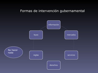 Este documento discute diferentes formas de intervención gubernamental para resolver problemas ambientales, incluyendo no hacer nada, impuestos por contaminación, subsidios para reducir emisiones o equipos de abatimiento, cumplimiento voluntario y pagos por no cumplimiento.