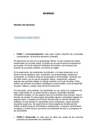 La autora describe su experiencia con el aprendizaje híbrido en el grado 9-4 de una institución educativa en Colombia. Los estudiantes asisten a clases presenciales con apoyo de tecnología como videos y presentaciones. También completan actividades virtuales independientes en una página creada por el docente. Los estudiantes deben cumplir con tareas presenciales como talleres y también desarrollar actividades virtuales en un plazo determinado. La autora concluye que los estudiantes se motivan más con este método pero que