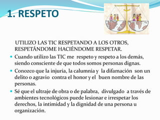 Este documento presenta 10 comportamientos digitales que promueven el uso responsable y ético de las tecnologías de la información y la comunicación (TIC). Estos comportamientos incluyen respetar a los demás, ejercer la libertad y respetar la de los demás, proteger la identidad y privacidad propia y de los demás, cuidar la integridad y seguridad personal y de los demás, ser responsable con la intimidad propia y de los demás, utilizar las TIC para el libre desarrollo personal y respetar las creencias de