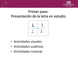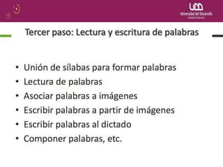 El documento describe el modelo de destrezas u orientado al código para la enseñanza de la lectura y la escritura. Este modelo se basa en la teoría conductista y enfatiza la enseñanza sistemática y gradual de las destrezas, comenzando con las vocales y el proceso de decodificación. El dominio del código es fundamental según este modelo, y la comprensión marca el final del proceso lector. El método sintético es una estrategia clave en este enfoque.