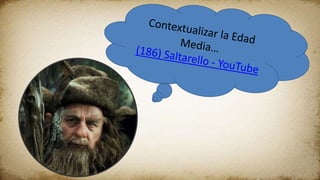 El documento resume las características principales de la Edad Media, dividiéndola en tres periodos: Alta Edad Media (476-1000 d.C.), Plena Edad Media (1000-siglo XIII) y Baja Edad Media (1000-1453). Se describe que durante la Alta Edad Media se formaron nuevos reinos germánicos luego de la caída del Imperio Romano y el surgimiento del feudalismo. La vida estaba centrada en la iglesia y la población era principalmente campesina.