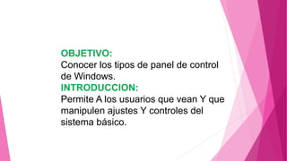 El panel de control de Windows permite a los usuarios configurar y administrar varios aspectos del sistema operativo como agregar hardware, cuentas de usuario, actualizaciones, seguridad, redes e impresoras. Ofrece opciones para personalizar la pantalla, idioma, sonido y accesibilidad. Es una herramienta clave para administrar y optimizar el rendimiento de Windows.
