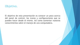 Este documento describe el panel de control de Windows y sus funciones. Explica que el panel de control permite cambiar la configuración de Windows como la hora, impresoras, teclado y ratón. También permite agregar hardware, instalar o eliminar software, y configurar aspectos más avanzados del ordenador. El panel de control varía dependiendo de la versión de Windows y permite realizar diversas configuraciones relacionadas con redes, programas, seguridad e internet.
