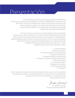 Este documento presenta un manual de formación para peluquería. Explica que el manual apoya un programa de formación laboral en peluquería en República Dominicana, brindando información sobre procedimientos, prácticas y herramientas. Describe los roles y responsabilidades de un peluquero, incluyendo corte de cabello, barba y bigote. También cubre temas como tipos de corte para niños, caballeros y adultos, así como materiales y equipos utilizados en una peluquería.