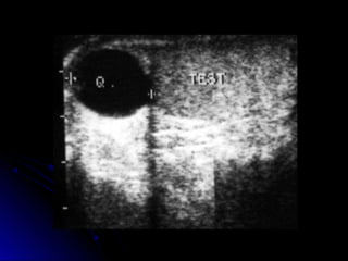 Este documento describe los quistes epididimarios, la criptorquidia y su diagnóstico y tratamiento. Los quistes epididimarios son masas benignas comúnmente encontradas en ecografías que se localizan en la cabeza del epidídimo. La criptorquidia implica la ausencia de descenso testicular al escroto. Su diagnóstico es clínico mediante exploración y la orquidopexia quirúrgica se realiza para lograr el descenso de los testículos afectados.