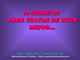 Este documento ofrece 10 secretos para tratar de vivir mejor. Estos incluyen mantener una actitud positiva, cuidar el cuerpo a través del ejercicio, vivir en el presente, amarse a uno mismo, establecer metas específicas, cultivar el humor, valorar las relaciones cercanas, practicar el perdón, dar desinteresadamente a otros, y tener fe. Siguiendo estos consejos, se puede acercar más a la felicidad.