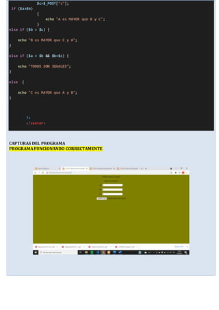 Este informe describe una práctica sobre operadores lógicos en PHP. El objetivo fue aprender a usar variables y el lenguaje PHP para desarrollar un programa que ingresa 3 números y determina si son iguales o si uno es mayor. Las actividades incluyeron crear un formulario para ingresar los números y usar operadores lógicos como >, && y = para comparar los números e imprimir el resultado.