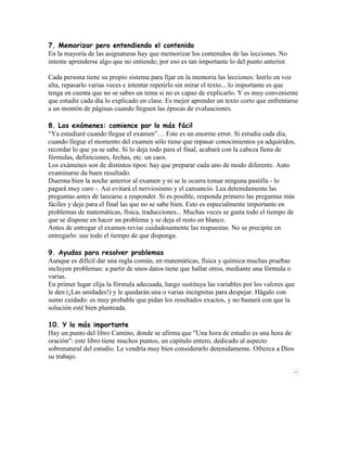 Este documento ofrece consejos para estudiar de manera efectiva. Enfatiza que se necesita motivación y un motivo propio para estudiar, como prepararse para el futuro. También recomienda adoptar una técnica de estudio propia, estudiar en un lugar tranquilo y con horario, aprovechar las clases, memorizar entendiendo el contenido, y comenzar los exámenes con las preguntas más fáciles. El documento concluye que se debe ofrecer a Dios el trabajo de estudio.