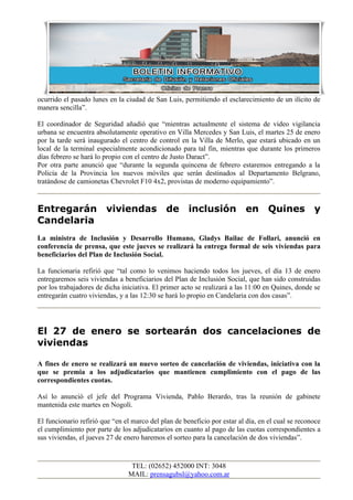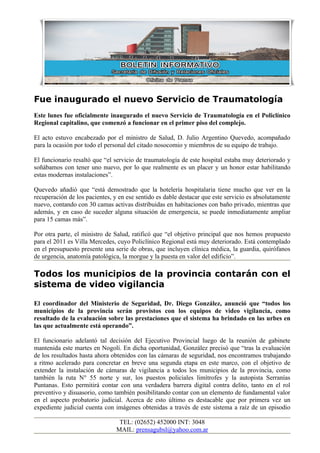 El nuevo Servicio de Traumatología en el Policlínico Regional capitalino fue inaugurado oficialmente. El ministro de Salud resaltó las modernas instalaciones y la importancia de la hotelería hospitalaria en la recuperación de los pacientes. El objetivo para 2011 es mejorar el Policlínico Regional de Villa Mercedes.