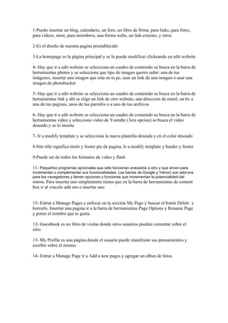 Este documento proporciona instrucciones sobre cómo personalizar una página web utilizando diferentes funciones y herramientas como insertar blogs, calendarios, foros, fotos, videos, tiendas, formularios, plantillas y páginas adicionales. Explica cómo agregar estos elementos arrastrándolos desde la barra de herramientas y modificar la apariencia y el contenido de la página principal y de otras páginas a través de la opción "Edit Website".