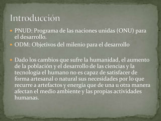 El PNUD es un programa de la ONU creado en 1965 para mejorar la calidad de vida de las naciones. Trabaja en áreas como la gobernabilidad democrática, reducción de la pobreza y medio ambiente. Los ODM establecidos en 2000 buscan erradicar la pobreza, lograr la educación primaria universal y mejorar la salud para 2015. Colombia ha trabajado con el PNUD en educación, salud y medio ambiente, aunque no ha recibido todo el apoyo solicitado para energías renovables.