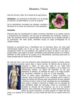 Deméter es la diosa griega de la agricultura. Su leyenda más famosa involucra el rapto de su hija Perséfone por Hades. Cuando Deméter no puede encontrar a Perséfone, se entristece tanto que se niega a hacer crecer los cultivos. Finalmente, Zeus negocia un acuerdo donde Perséfone pasa seis meses del año con Hades en el inframundo y los otros seis meses con Deméter.