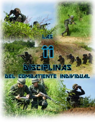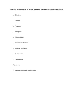 Este documento describe 11 disciplinas fundamentales para un soldado venezolano: orientarse, observar, progresar, protegerse, enmascararse, apreciar una distancia, designar un objetivo, usar su arma, comunicarse, informar y mantener contacto con su unidad. Cada disciplina se define brevemente, destacando habilidades como determinar direcciones, buscar información sobre el enemigo, avanzar de forma segura usando el terreno, tomar medidas de protección y ocultarse del enemigo.
