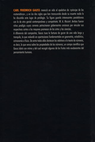 Este documento presenta una introducción a la vida y obra del matemático alemán Carl Friedrich Gauss. Resume que Gauss fue considerado uno de los matemáticos más importantes de la historia debido a la importancia y amplitud de sus contribuciones matemáticas. Describe brevemente algunos de sus logros clave como el descubrimiento de un método para construir polígonos regulares y el desarrollo del método de mínimos cuadrados para calcular órbitas planetarias.