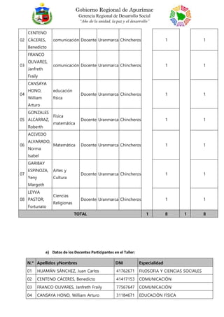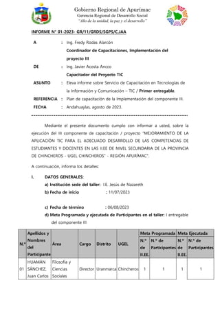 El informe detalla la ejecución del tercer componente del proyecto de capacitación en TIC para docentes de secundaria en Chincheros, Apurímac, entre julio y agosto de 2023, logrando la participación total de ocho docentes. Se llevaron a cabo sesiones de capacitación en las que se abordaron temas como el currículo nacional y la personalización de entornos virtuales, alcanzando tasas de éxito del 100% en el uso de herramientas de Microsoft. Sin embargo, se identificaron dificultades relacionadas con la disponibilidad de tiempo y la conexión a Internet de los participantes, sugiriendo la entrega de paquetes de Internet gratuitos para mejorar el acceso a las capacitaciones.