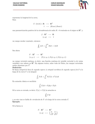 Este documento describe los conceptos matemáticos de integrales curvilíneas y de superficie. Explica cómo calcular la integral de un campo escalar o vectorial a lo largo de una curva o sobre una superficie parametrizada. También introduce conceptos como el trabajo realizado por una fuerza constante y el flujo de un campo eléctrico a través de una esfera.