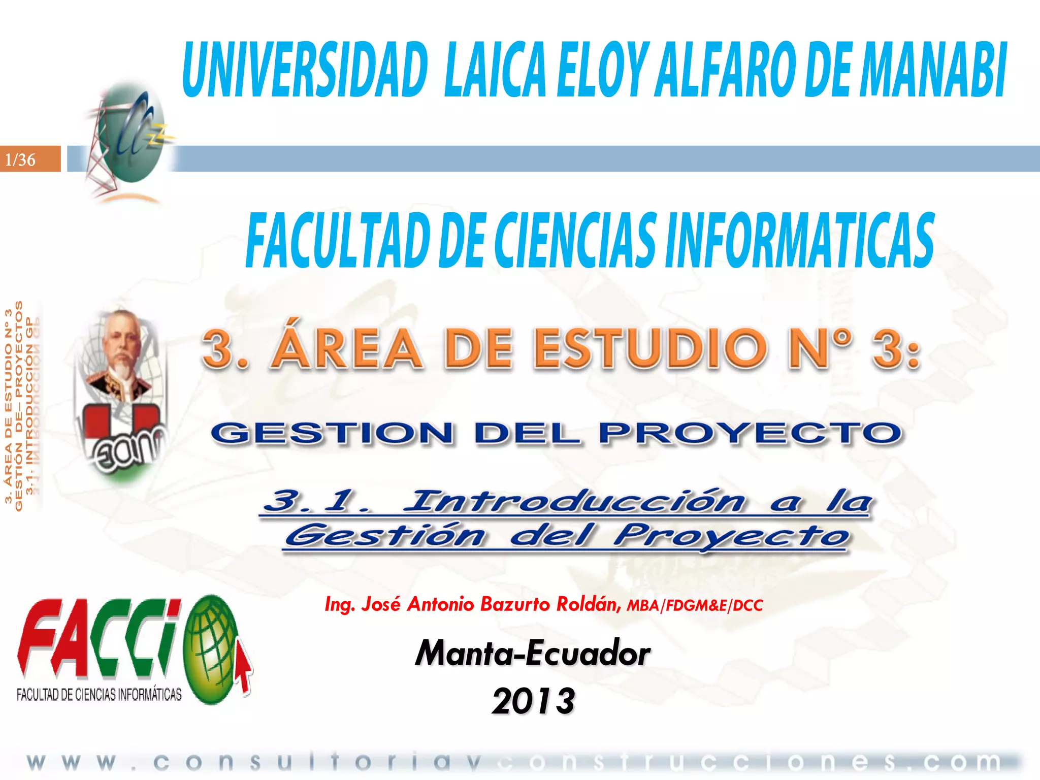 Este documento presenta los objetivos de conocer los aspectos esenciales de una teoría de proyectos, identificar y definir las fases de un proyecto con apoyo de herramientas de gestión de proyectos, entender los pasos para llevar a cabo un proyecto, comprender la noción de proyectos y el rol del PMBOK, y conocer herramientas y técnicas empleadas en gestión de proyectos. También resume brevemente la evolución histórica de los proyectos y conceptos como el método analí