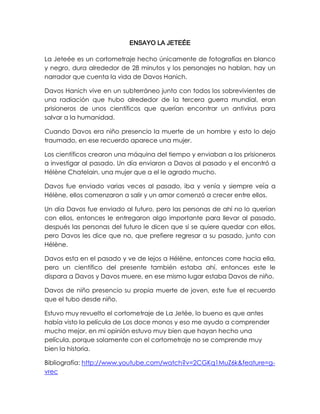 La película La Jetée narra la historia de Davos Hanich, un hombre que vive en un refugio subterráneo después de la Tercera Guerra Mundial. Los científicos lo envían a través del tiempo para investigar el pasado. Davos se enamora de una mujer llamada Hélène Chatelain que ve repetidamente durante sus viajes. Al final, Davos decide quedarse en el pasado con Hélène, pero es asesinado por un científico, presenciando así su propia muerte que había visto de niño.