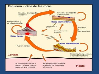 Este documento introduce los conceptos básicos de petrografía, petrogénesis y petrología. Explica que la petrografía es el estudio descriptivo de las rocas, mientras que la petrogénesis estudia su origen. La petrología es el estudio más amplio de las rocas, incluyendo su composición, clasificación y relación con procesos geológicos. Luego clasifica las rocas en ígneas, sedimentarias y metamórficas según su origen y procesos de formación.