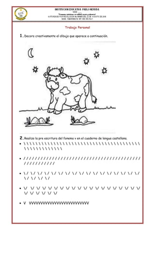 Este documento presenta varias actividades para que los estudiantes exploren y desarrollen su comprensión del fonema "v" en español. Incluye observar y colorear dibujos con palabras que comienzan con "v", practicar la escritura del fonema, aprender vocabulario, completar dictados y formar palabras recortando letras. El objetivo es que los estudiantes se familiaricen con el sonido y la escritura de la letra "v" a través de diferentes ejercicios prácticos.