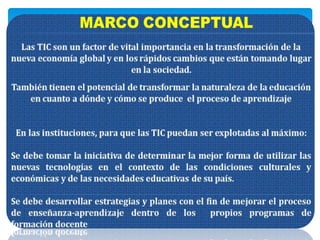 El documento presenta el marco conceptual de las TIC para el desarrollo. Explica que el marco ha sido adoptado a nivel local, nacional e internacional para identificar prioridades de investigación y desarrollo de políticas, coordinar actores e implementar proyectos, y monitorear el progreso hacia sociedades de la información. También analiza las aplicaciones y fortalezas del marco, aunque reconoce que no es un modelo dinámico para hacer predicciones.