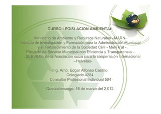 Este documento trata sobre conceptos relacionados con el medio ambiente y la legislación ambiental en Guatemala. Define el medio ambiente como el conjunto de factores naturales, sociales y culturales que afectan la vida humana y las generaciones futuras. Explica que una comunidad biológica se refiere a los seres vivos en un ecosistema, y que factores como el clima y la disponibilidad de recursos regulan estas comunidades. Por último, señala que la ley guatemalteca define el medio ambiente como los sistemas atmosféric