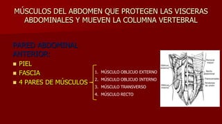 Este documento describe los músculos principales de la pared abdominal anterior. Identifica cuatro pares de músculos - el oblicuo externo, el oblicuo interno, el transverso y el recto abdominal. Explica que los primeros tres forman tres capas musculares entrelazadas que protegen las vísceras abdominales, mientras que el recto abdominal se extiende longitudinalmente a lo largo de la pared abdominal. También describe estructuras como la vaina de los rectos, la línea alba, el ligamento inguinal y el anillo inguinal