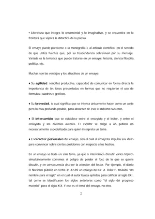 El documento ofrece sugerencias para la redacción de ensayos. Define un ensayo como un texto breve que expone, analiza y comenta un tema desde un punto de vista personal. Explica que un ensayo debe tener una introducción, desarrollo de ideas con argumentos y una conclusión. También destaca la importancia de considerar aspectos como el estilo, el contenido y la forma al redactar un ensayo.