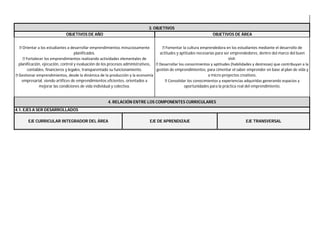 Este documento presenta el plan curricular anual para el área/asignatura de Emprendimiento del tercer año de bachillerato. El plan describe los objetivos del área, que incluyen orientar a los estudiantes a desarrollar emprendimientos planificados y fortalecer la cultura emprendedora. También presenta la carga horaria, los estándares de calidad, la temporalización de los bloques curriculares y sus objetivos, así como los instrumentos y metodología de evaluación.