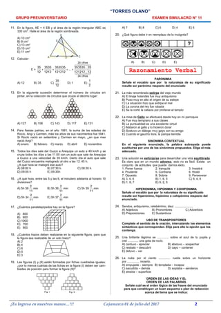 Este documento presenta un examen simulacro de razonamiento matemático y verbal para un grupo preuniversitario. Contiene 10 preguntas de razonamiento matemático y 8 de razonamiento verbal sobre temas como series numéricas, porcentajes, lógica y lenguaje. El examen es utilizado para evaluar las habilidades académicas de los estudiantes en estas áreas.