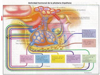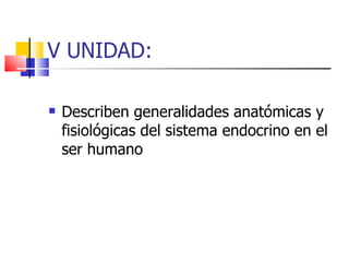 El documento describe el sistema endocrino humano. El sistema endocrino regula funciones vitales a través de hormonas secretadas por glándulas como la hipófisis, tiroides, páncreas y suprarrenales. Las hormonas viajan en la sangre y controlan procesos como el metabolismo, crecimiento y desarrollo, y funciones reproductivas. Trastornos en la secreción de hormonas pueden causar enfermedades endocrinas.