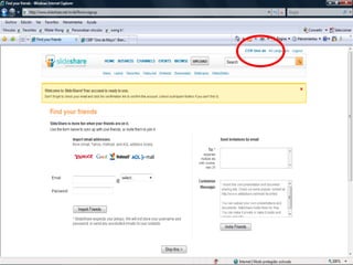Este documento proporciona instrucciones para subir presentaciones al sitio web SlideShare y luego insertarlas en un blog. Explica cómo buscar una presentación en SlideShare, copiar el código de incorporación y pegarlo en un blog. También describe el proceso de registro en SlideShare para poder subir tus propias presentaciones, incluyendo los pasos para cargar archivos, agregar un título, descripción y categoría, y hacer clic en Publicar.