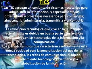 El documento describe las tecnologías de la información y la comunicación (TIC), incluyendo su definición, evolución e impacto. Explica que las TIC agrupan sistemas para administrar información como ordenadores y programas. Su uso se ha generalizado y han acelerado el desarrollo tecnológico y científico. También analiza las aplicaciones de las TIC en el ámbito laboral como correo electrónico, páginas web y sistemas de gestión de clientes.