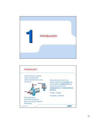 El documento describe los conceptos básicos de la transmisión de potencia y cómo afecta a los rodamientos. Explica que toda transmisión de potencia genera fuerzas sobre los rodamientos que soportan los ejes, y que estas fuerzas afectan directamente la vida útil de los rodamientos. Además, detalla los diferentes tipos de transmisión como poleas, cadenas, engranajes y correas, y cómo cada uno genera fuerzas radiales, axiales o combinadas sobre los rodamientos.