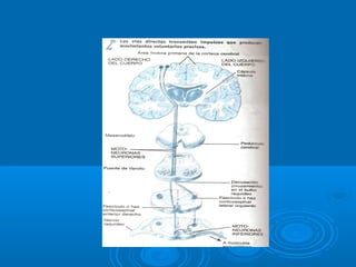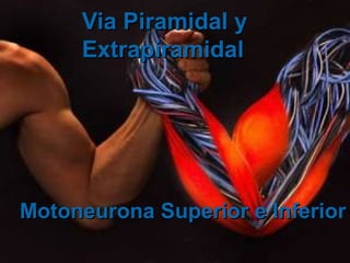 Este documento describe las vías motoras piramidal y extrapiramidal. La vía piramidal se origina en la corteza motora y comprende los haces corticoespinales directos e indirectos y corticobulbares. La vía extrapiramidal involucra circuitos polisinápticos que incluyen los ganglios basales, cerebelo y formación reticular. También describe síndromes asociados con lesiones de la motoneurona superior e inferior.