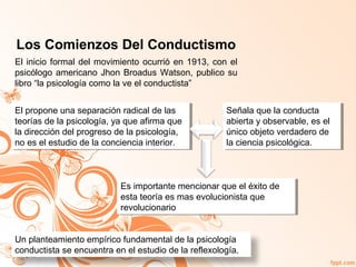 El conductismo surgió en 1913 de la mano del psicólogo estadounidense John Watson, quien propuso estudiar solo la conducta observable y rechazó el estudio de procesos mentales internos. Los fisiólogos rusos como Sechenov y Bekhterev sentaron las bases al reducir la psicología a reflejos, mientras que Pavlov descubrió el condicionamiento clásico. El conductismo se expandió con conductistas como Thorndike y sus principios de aprendizaje, y Watson que creía en la asociación como clave