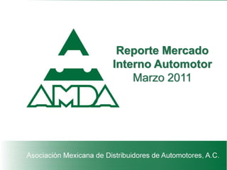 Este documento resume los mercados automotrices internacionales y la coyuntura macroeconómica de México en marzo de 2011. La producción mundial de automóviles creció un 25.8% en 2010, liderada por Asia Pacífico. México ocupó el noveno lugar en producción mundial. Las ventas internas mexicanas crecieron un 8.7% en 2010 luego de caer 26.4% en 2009, ubicándose en el puesto 15 a nivel global. El Indicador Global de Actividad Económica de México creció un 5.