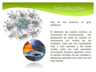 El documento describe los principios del eco urbanismo y las ecociudades. Explica que el eco urbanismo busca desarrollar comunidades humanas sostenibles que se integren armoniosamente con el entorno natural. También define una ecociudad como una ciudad diseñada siguiendo principios ecológicos para minimizar su huella ecológica y dependencia de recursos externos mediante el uso de energías renovables y un diseño urbano que favorezca la movilidad peatonal.