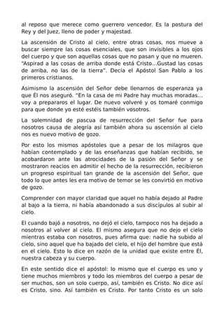 La Ascensión del Señor describe cómo Jesús ascendió a los cielos 40 días después de su resurrección, dándole a sus discípulos la orden de predicar el Evangelio en todo el mundo. Su ascensión simboliza su glorificación y exaltación tras su humillación en la crucifixión. Ahora Jesús está vivo en el cielo, pero también permanece con sus discípulos hasta el fin de los tiempos a través del Espíritu Santo. Su ascensión da esperanza a los cristianos de que un día estarán con él en el cielo