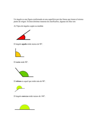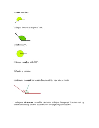 El documento define los diferentes tipos de ángulos según su medida, posición, suma y relación con paralelas y circunferencias. Los ángulos se clasifican como agudos, rectos, obtusos, convexos, llano, cóncavos y nulos según su medida. También se definen ángulos consecutivos, adyacentes y opuestos por el vértice según su posición. Existen ángulos complementarios y suplementarios según su suma. Finalmente, se describen los ángulos entre paralelas y una recta transversal,