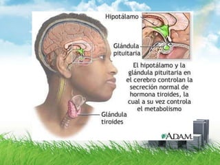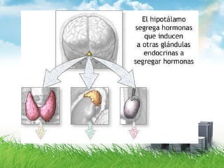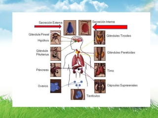 El documento resume el sistema endocrino, incluyendo las glándulas endocrinas principales y las hormonas que producen. Describe las glándulas hipotálamo, hipófisis, tiroides, paratiroides, suprarrenales, gonadas y páncreas. Explica que las hormonas actúan en procesos como el crecimiento, metabolismo, reproducción y desarrollo.
