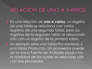 Una relación de uno a varios permite que un registro en una tabla se relacione con múltiples registros en otra tabla, pero los registros en la segunda tabla solo se pueden relacionar con un único registro en la primera tabla. Por ejemplo, un proveedor individual puede suministrar múltiples productos, donde cada producto solo se puede asociar con ese proveedor único.